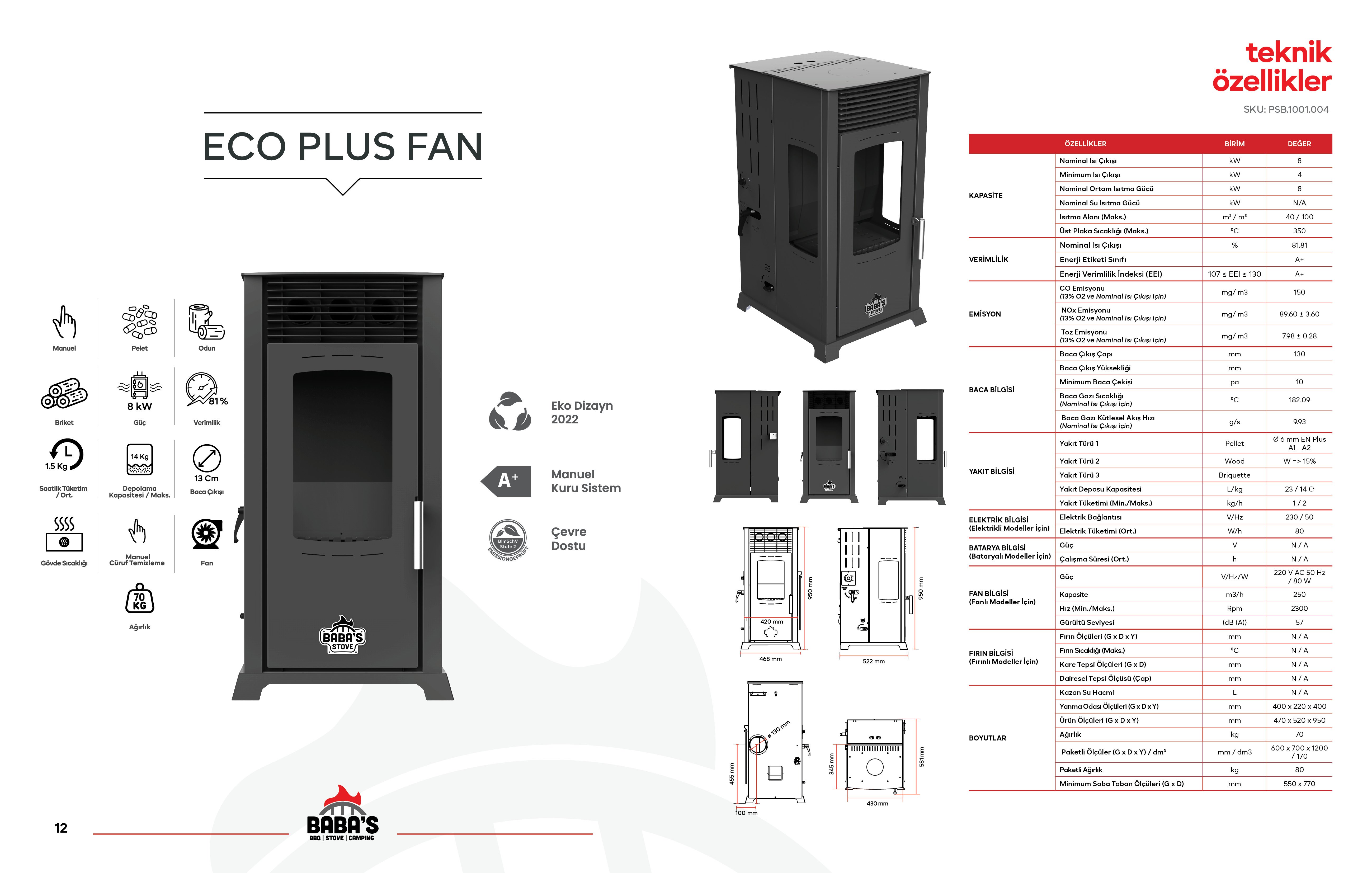 · Eco PLUS 8 KW FAN: Üç camlı bir yapıya sahiptir ve fanlıdır. Fan sobanın çalışması için gerekli değildir. Amacı sobanın üzerinde biriken sıcaklığın ortama hızlı bir şekilde dağılımını sağlamaktır. Kullanımı opsiyoneldir.