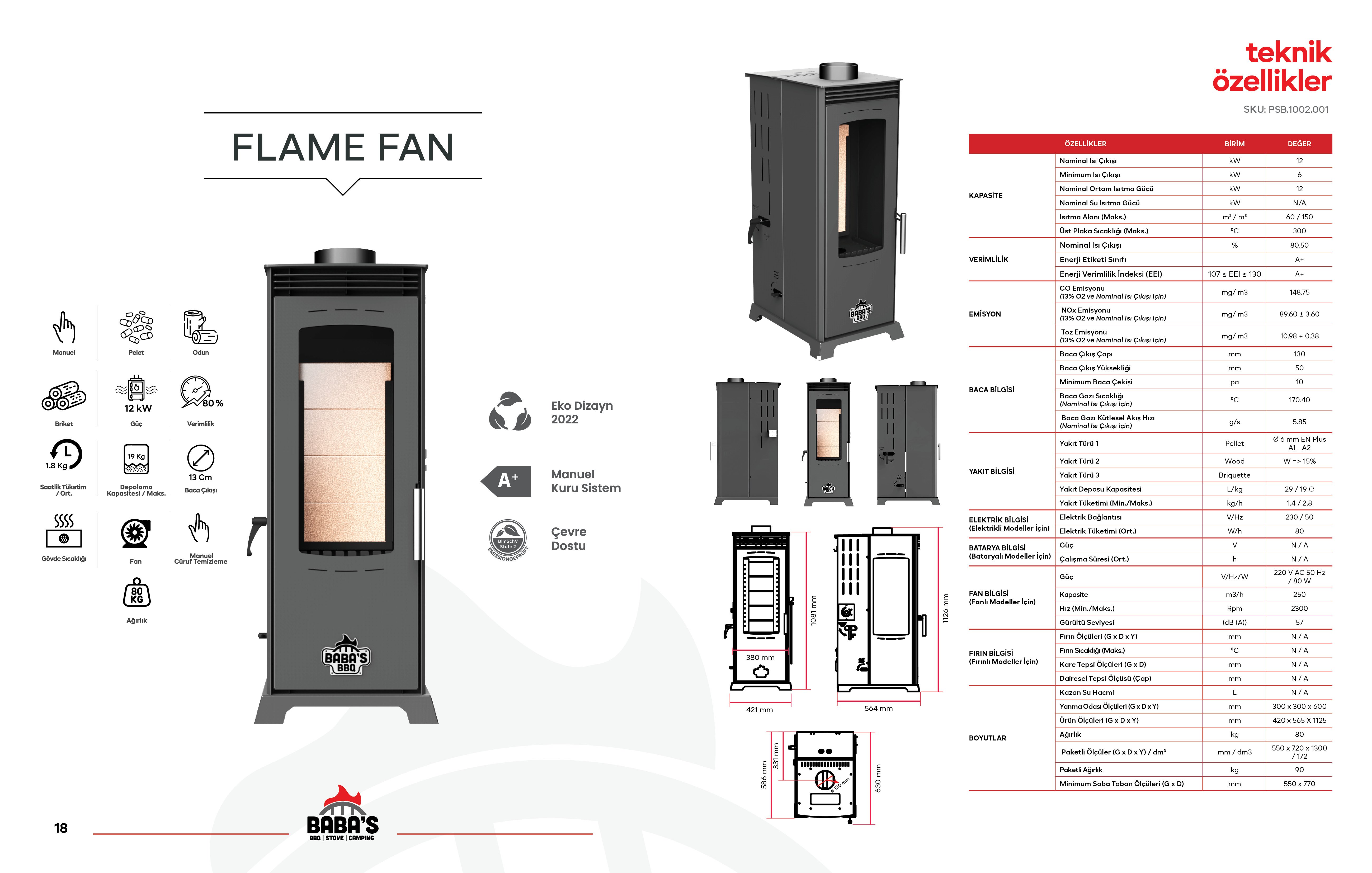 · Flame Fan 12 KW: Tek camlı bir yapıya sahiptir ve fanlıdır. Fan sobanın çalışması için gerekli değildir. Amacı sobanın üzerinde biriken sıcaklığın ortama hızlı bir şekilde dağılımını sağlamaktır. Kullanımı opsiyoneldir.