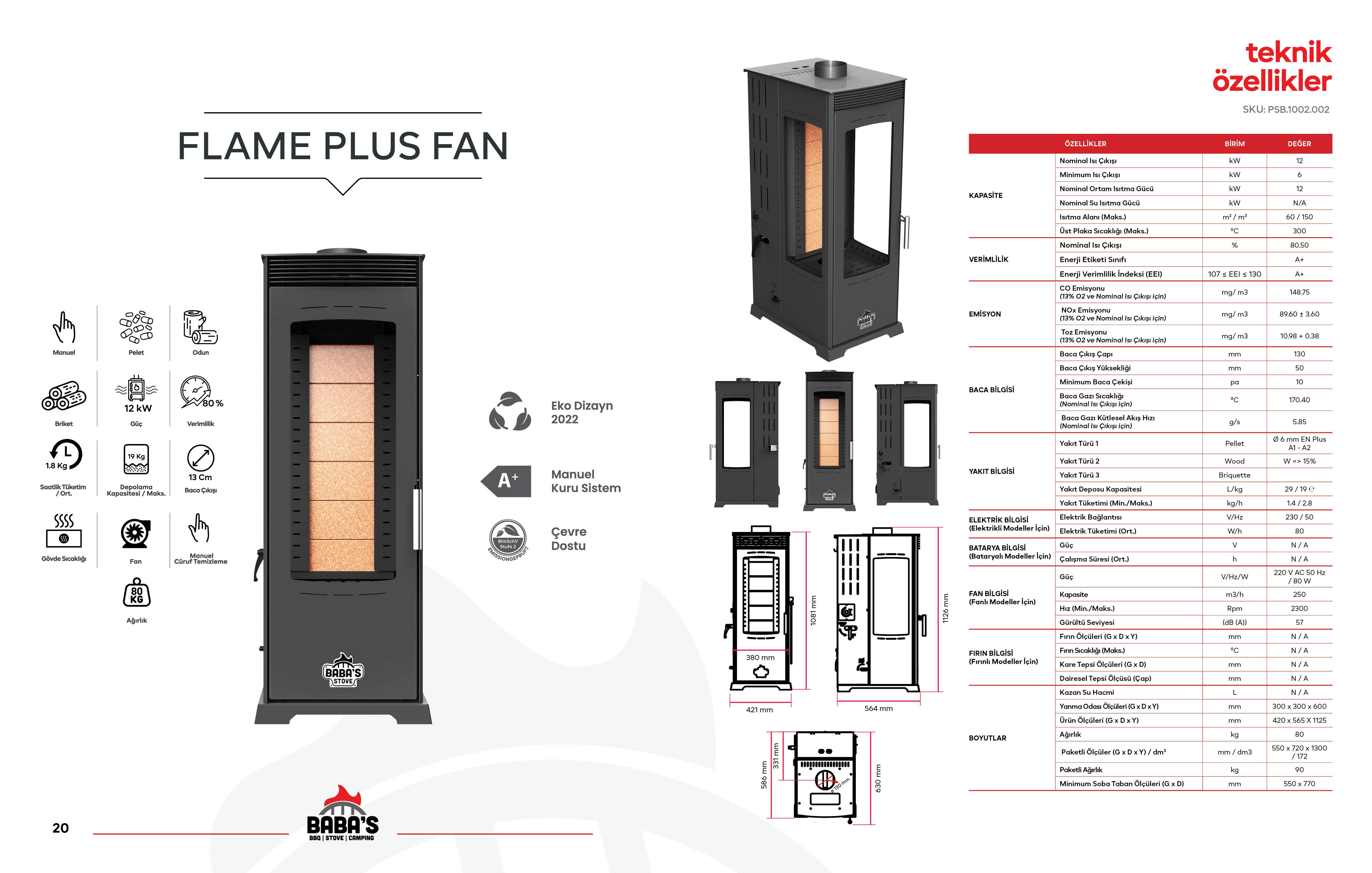 § Flame Plus Fan 12 KW: Üç camlı bir yapıya sahiptir ve fanlıdır. Fan sobanın çalışması için gerekli değildir. Amacı sobanın üzerinde biriken sıcaklığın ortama hızlı bir şekilde dağılımını sağlamaktır. Kullanımı opsiyoneldir.