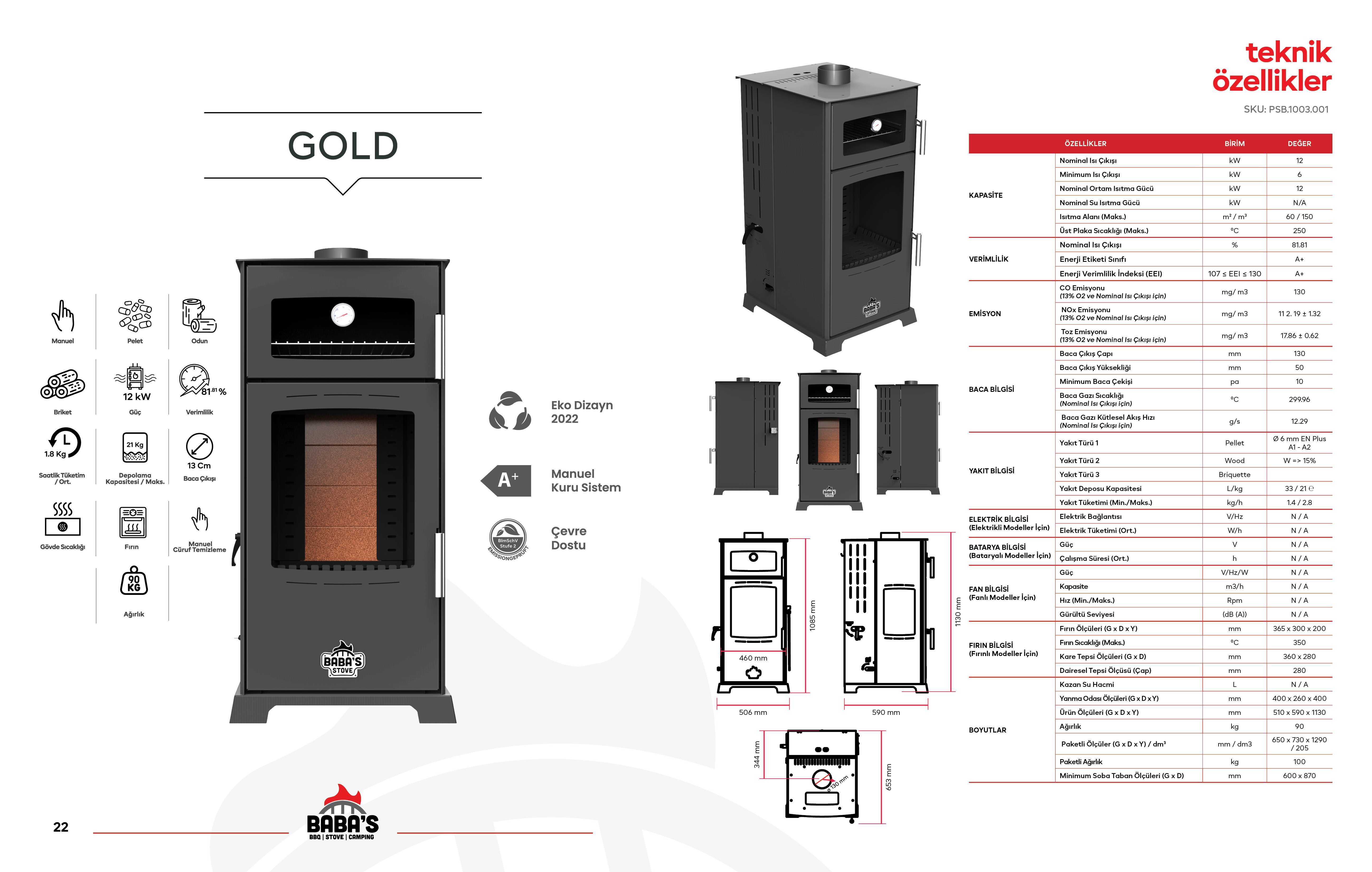 · Gold 12 KW serisi; pelet, odun ve briket odunu yakabilen manuel kullanımlı fırınlı sobalardır. Seride iki farklı gövde seçeneği bulunmaktadır. (6 mm çapında A1 kalite Çam Peleti yakmaya uygundur.)