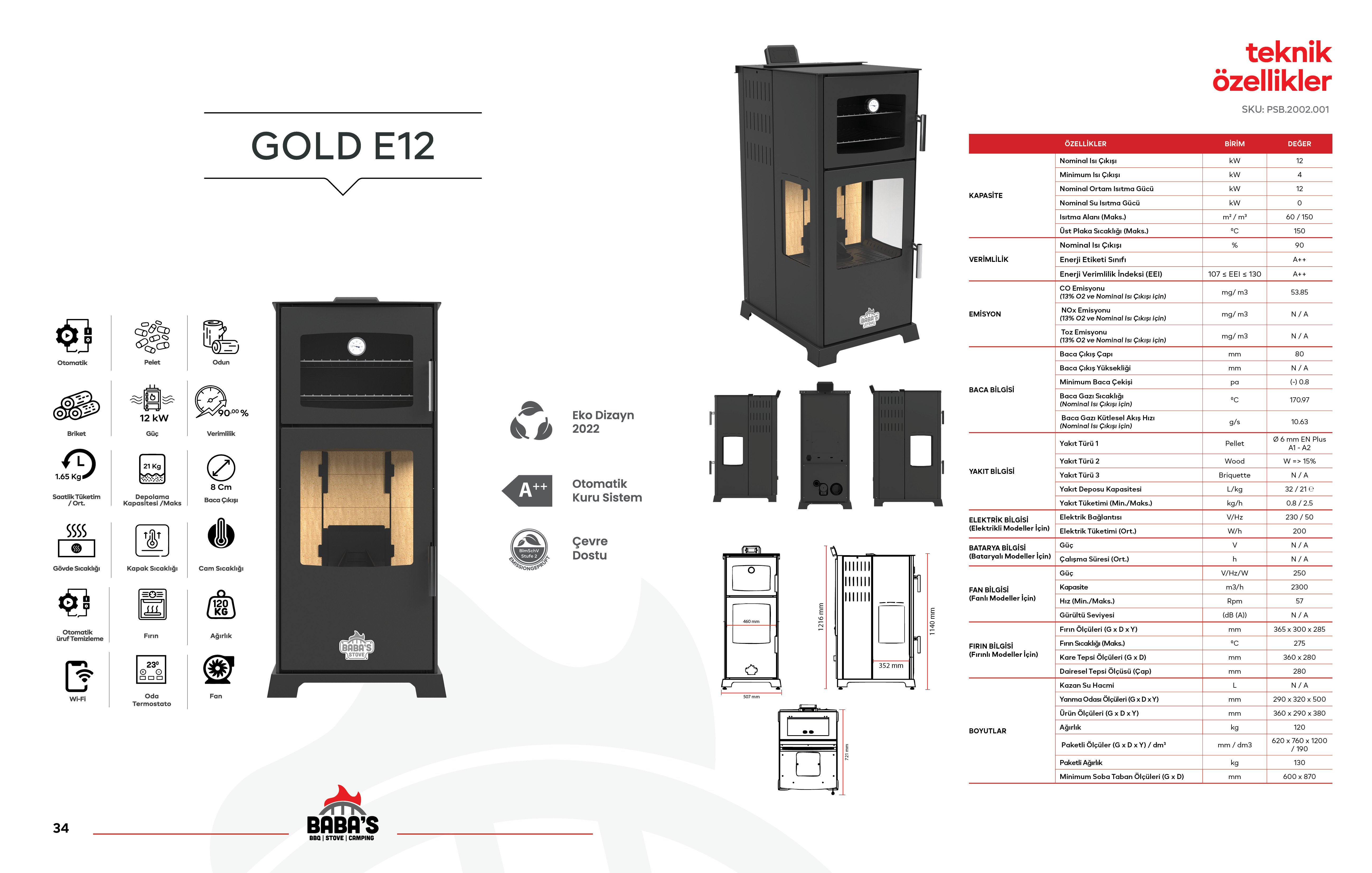 - Gold E 12; pelet, odun ve briket odunu yakabilen otomatik çalışan fırınlı bir sobalardır. (6 mm çapında A1 kalite Çam Peleti yakmaya uygundur.) ·