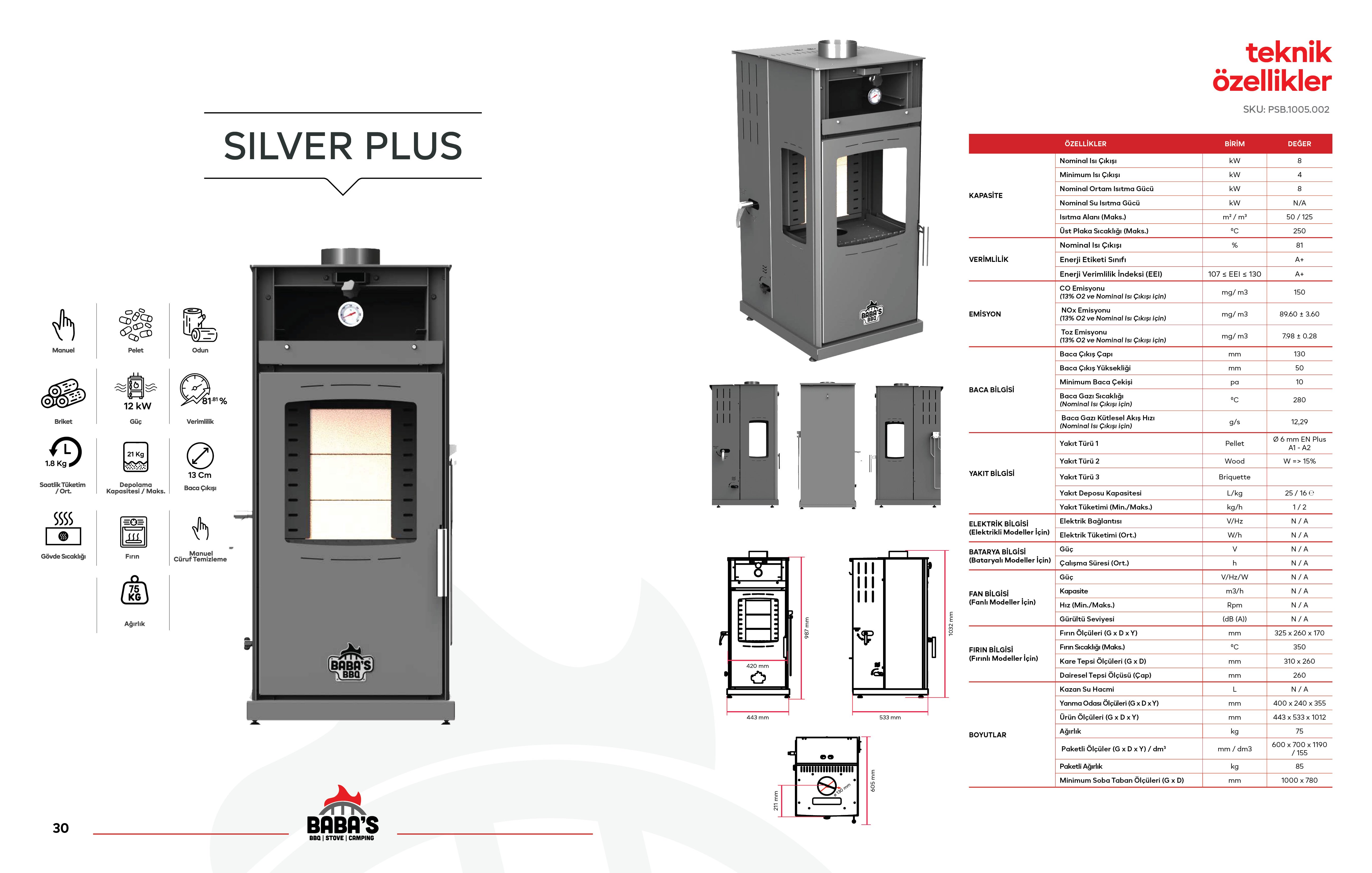 · Silver 8 KW serisi; pelet, odun ve briket odunu yakabilen manuel kullanımlı fırınlı sobalardır. Seride iki farklı gövde seçeneği bulunmaktadır. (6 mm çapında A1 kalite Çam Peleti yakmaya uygundur.)